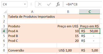Marcos precisa dos preços do Prod B e do Prod C, obtidos em reais com base na taxa de conversão. A tabela de produtos importados deve obter o preço do produto em dólar e multiplicar pela taxa de conversão (moeda dólar para moeda real) e obter o preço do produto em real. Marcos efetuou a fórmula apresentada em C4 e, após obter a resposta, arrastou a célula pela alça de preenchimento de C4 até a célula C6. Os resultados obtidos estão apresentados na planilha. O insucesso da operação realizada por Marcos, especificamente pelos resultados visualizados nas células C5 e C6, deve-se a:
