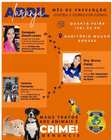 As forças de Segurança Pública do Estado de Goiás aderiram ao abril laranja, mês simbólico de proteção aos animais. Dentre as várias ações da campanha, o foco neste ano é conscientizar sobre o crime de maus tratos aos animais, cujos tipos penais