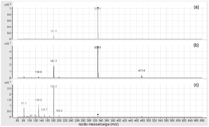 Considerando os gráficos acima, que representam espectros de massas de fragmentação (EM/EM) de um íon com m/z = 330,0 de uma truxilina, obtidos com três diferentes energias de colisão — collision-induced dissociation (CID): (a) CID = 5, (b) CID = 10 e (c) CID = 20, julgue os itens de 102 a 109 , relativos à espectrometria de massas. A resolução dos espectros de massas mostrados indica que o espectrômetro de massas utilizado nesse experimento possui pelo menos um analisador de massas do tipo tempo de voo.