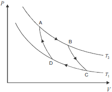 No ciclo de Carnot, ilustrado acima, no gráfico de pressão ( P ) versus volume ( V ), ocorrem processos reversíveis que passam pelos estados A, B, C e D. Considerando que as curvas do gráfico apresentam o comportamento de um gás ideal em um sistema fechado, que os processos BC e DA são adiabáticos e que AB e CD são isotérmicos, ocorrendo nas temperaturas T 2 e T 1, respectivamente, julgue o item subsequente. Nas condições especificadas, se T 1 for menor do que T2 , o rendimento desse ciclo será de 100%.
