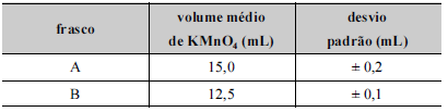 O teor de ferro em dois frascos (A e B) de um medicamento, presente na forma de sulfato ferroso, foi determinado por meio de volumetria de oxidação-redução, utilizando-se KMnO4 0,01 mol/L como titulante, em meio ácido. O frasco A estava lacrado e o frasco B encontrava-se aberto, com menos da metade de seu volume inicial. Para a análise, 5,00 mL do medicamento de cada frasco foram diluídos em água e o volume, completado para 100,00 mL. Em seguida, alíquotas de 30,00 mL das soluções resultantes foram acidificadas com H2SO4 e diretamente tituladas em triplicata com o KMnO4. A tabela abaixo mostra os volumes médios de permanganato gastos e seus desvios padrões em mL.