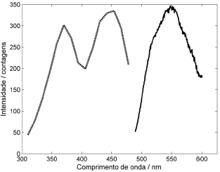 A utilização dos fenômenos de fluorescência e fosforescência molecular como técnicas analíticas possibilitou o desenvolvimento de vários métodos de alta sensibilidade. A figura acima apresenta os espectros de excitação e emissão da molécula de riboflavina. Com relação a esses espectros e à fluorescência e fosforescência molecular, julgue o item a subsecutivo. Pode-se aumentar a intensidade de fluorescência de uma amostra realizando-se as medidas em temperaturas mais baixas, em solventes mais viscosos e na ausência de oxigênio dissolvido e de haletos.