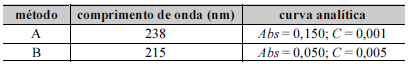 O cloridrato de fluoxetina (massa molar = 309,33 g/mol; Ka = 2 × 10-9 ) é um princípio ativo presente em medicamentos antidepressivos indicados contra depressão de moderada a grave. Para realizar a análise desse princípio ativo em uma amostra foi empregada a espectrometria na região ultravioleta-visível. Dois métodos analíticos (A e B) foram desenvolvidos em comprimentos de onda diferentes e forneceram as curvas analíticas descritas na tabela abaixo, em que Abs é o valor medido de absorbância e C é a concentração de cloridrato de fluoxetina em mg/L.