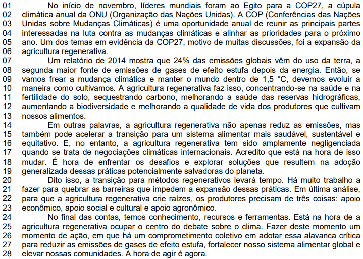 Com base no texto 4, indique se as afirmativas abaixo são verdadeiras (V) ou falsas (F) e assinale a alternativa com a sequência correta de cima para baixo. ( ) O título pode ser reescrito da seguinte maneira, sem alteração de sentido: “O dever das empresas junto ao equilíbrio da agricultura regenerativa”. ( ) As siglas ONU, COP27 e COP fazem menção ao mesmo evento ocorrido do início de novembro. ( ) Dados revelam que o modo de cultivo da terra é uma fonte de emissão de gases de efeito estufa. ( ) As negociações climáticas internacionais estão desatentas para o papel da agricultura regenerativa em relação à redução de emissões de gases. ( ) As expressões “Em outras palavras” (linha 14), “Dito isso” (linha 20) e “No final das contas” (linha 24) contribuem para orientar a interpretação do texto, criando elos entre as ideias.