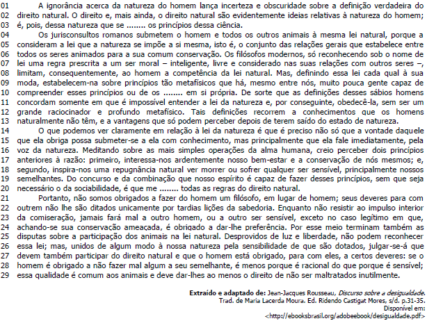 I. Rousseau ironiza “[...]as definições desses sábios homens” quando diz que elas “concordam somente em que é impossível entender a lei da natureza […] sem ser um grande raciocinador e profundo metafísico” (l. 10-12).