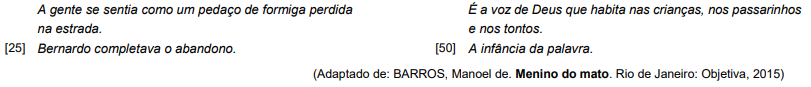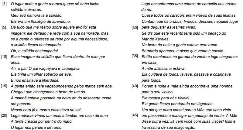 “ Um dia que outro contei para a Mãe que tinha visto / um passarinho a mastigar um pedaço de vento. ” (versos 44 e 45) Ao se transpor o trecho acima para o discurso direto, a locução verbal sublinhada assume a seguinte forma: