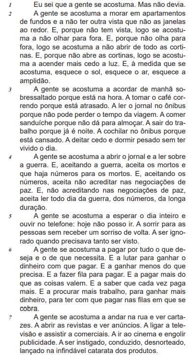 Considere a seguinte passagem do texto: “Eu sei que a gente se acostuma. Mas não devia.” (parágrafo 1) Na opinião da autora, as várias situações apresentadas ao longo do texto têm como consequência o fato de o ser humano