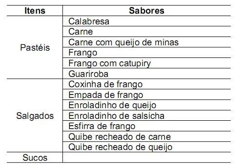 A tabela a seguir mostra as opções de uma lanchonete.