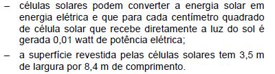 Assim sendo, se a luz do sol incidir diretamente sobre tais células, a potência elétrica que elas serão capazes de gerar em conjunto, em watts, é: