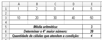 1. Célula "E5": determinar a média aritmética dos números apresentados nas células "A1" e "E1", somente. 2. Célula "E6": determinar o "4º" (quarto) maior número no intervalo das células de "A3" até "E3". 3. Célula "E7": determinar a quantidade de células não vazias no intervalo de células de "A1" até "E1". Os números que aparecem nessas células devem ser maiores ou iguais a "1" (um). As expressões inseridas nas células "E5", "E6" e "E7" são, respectivamente: