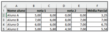 Em uma planilha criada no Microsoft Excel 2016, a coluna "Média Parcial" (F) contém a média das médias das colunas em nota 1 e nota 2, conforme vemos na planilha.