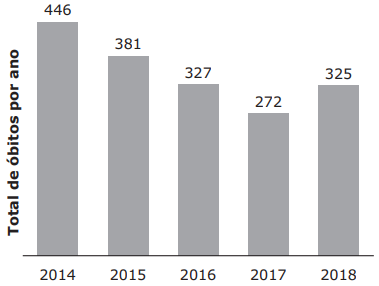 O setor da construção civil possui um alto índice de acidentes de trabalho. O gráfico a seguir mostra o número de óbitos registrados na construção civil no Brasil entre 2014 e 2018.