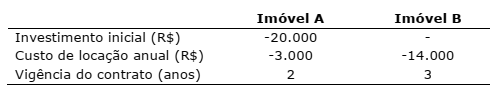 Uma empresa precisa realizar a locação de um ponto comercial para instalar a sua nova filial. O proprietário da empresa encontrou dois imóveis adequados e solicitou ao seu gerente financeiro um estudo com base nas propostas mutuamente exclusivas, apresentadas na tabela abaixo. Ambas as propostas podem ser renovadas com a imobiliária nos mesmos termos.