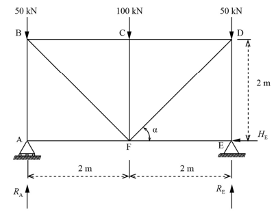 Com base na figura precedente, que ilustra uma treliça plana reticulada, simétrica em relação ao eixo vertical que passa pelo trecho CF, com um apoio móvel no nó A e um fixo no nó E, e submetida ao carregamento indicado, julgue o item a seguir.