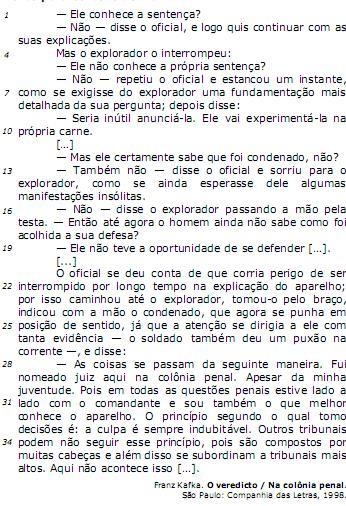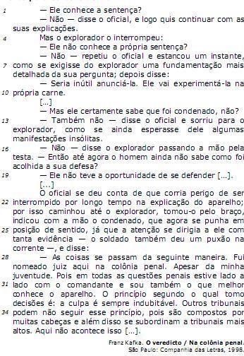 disse o explorador passando a mão pela testa. — Então até agora o homem ainda não sabe como foi acolhida a sua defesa?" (linhas de 16 a 18) poderia ser corretamente reescrito sob a forma de discurso indireto da seguinte maneira: Passando a mão pela sua testa, o explorador disse que não e perguntou, então, se até agora o homem não sabe como sua sentença tinha sido acolhida.