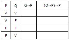 Considere que P e Q sejam proposições simples. Então, completada a tabela a seguir, é correto concluir que os elementos da coluna correspondente à proposição composta (Q→P)→P, na ordem em que aparecem e de cima para baixo, são VVFV.