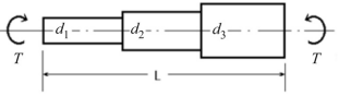 Considere a figura a seguir, que ilustra uma árvore de transmissão escalonada, com seções de diâmetros d1, d2 e d3 ao longo do comprimento L, sob a ação de um torque T. Nesse caso, para o cálculo da deflexão angular θ que a árvore sofrerá, deve-se considerar cada segmento da árvore com diâmetro di como molas de rigidez ki em série, tal que , em que θ = T/keq = 1/k1 + 1/k2 + 1/k3