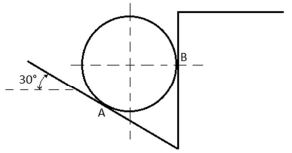 Considere a situação da figura a seguir, que ilustra uma esfera de 50 kg, homogênea e regular, apoiada no ponto A do plano inclinado a 30° e no ponto B da parede vertical. Considere também que a aceleração da gravidade seja igual a 10 m/s2 e que cos(30°) = 0,9 e cos(60°) = 0,5. Nesse caso hipotético, o esforço que a esfera faz contra a parede em B é inferior a 300 N.