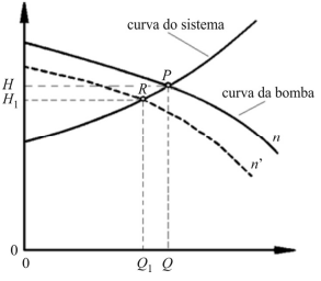 Considere que, em uma instalação de bombeamento, uma bomba esteja operando no ponto P(Q, H) identificado na figura a seguir. Nesse caso, se a rotação do motor for reduzida de n para n’, passando a operar no ponto R(Q1, H1), a perda de carga total da instalação aumentará.