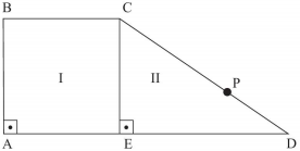 Na figura, que representa uma pequena praça, a região I tem a forma de um quadrado (ABCE) com área de 225 m2, e a região II tem a forma de um triângulo retângulo (CDE). Para se ir do ponto A ao ponto P, contornando a praça, pode-se optar pelo trajeto ABCP, ou pelo trajeto AEDP, sendo que, em ambos os casos, as distâncias percorridas serão iguais. Sabendo-se que o segmento CD mede 25 m, pode-se afirmar que a distância entre os pontos D e P é igual a