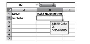 Antônio montou uma planilha na qual, ao selecionar a célula, o digitador é informado sobre o tipo de dado que deve ser inserido. Para dar essa característica à planilha, no momento de sua construção, Antônio utilizou, do MS-Excel 2007, em sua configuração padrão, o recurso