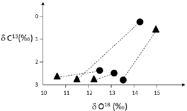 Na maior parte das amostras, os valores de δ O18 e de δ C13 das calcitas são maiores que os das dolomitas coexistentes.