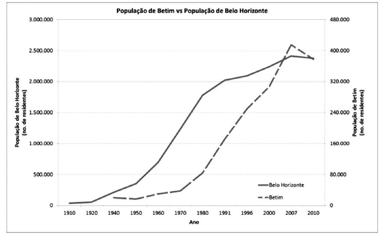 O gráfico a seguir apresenta informações a respeito do crescimento populacional das cidades de Betim e Belo Horizonte, do estado de Minas Gerais, de 1910 a 2010.