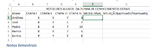 Uma professora mantém o controle das notas de seus alunos em uma planilha Excel 2013, conforme revela a figura. Sabendo-se que, para o aluno ser aprovado, a média aritmética deve ser maior ou igual a 6, as funções do Excel 2013, que facilitarão a tarefa da professora, no momento da determinação da média que deve ser colocada na coluna F e da situação do aluno mostrada na coluna G, são
