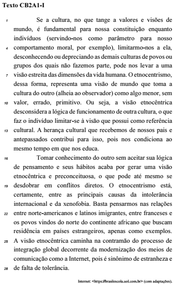O trecho “Tomar conhecimento (...) preconceituosa” (ℓ. 16 a 18) poderia ser reescrito, sem prejuízo da correção gramatical e do sentido do texto, da seguinte forma: Tomar conhecimento do outro sem aceitar a lógica de seu pensamento e sem acatar a lógica de seus hábitos acabam gerando uma visão etnocêntrica e preconceituosa.