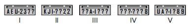 Em um posto de fiscalização da PRF, cinco veículos foram abordados por estarem com alguns caracteres das placas de identificação cobertos por uma tinta que não permitia o reconhecimento, como ilustradas abaixo, em que as interrogações indicam os caracteres ilegíveis.