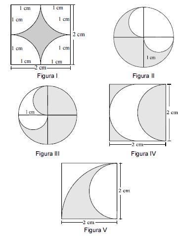 Considerando, em relação às figuras acima, que, na figura I, as 4 curvas são quartos de círculo; nas figuras II, III e IV, as curvas são 2 semicírculos; na figura V, aparece 1 quarto de círculo e, interno a ele, um semicírculo, nessa situação, as figuras em que as partes sombreadas têm áreas iguais são