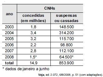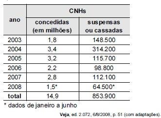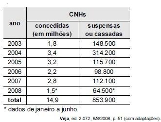 Para que a média de CNHs suspensas ou cassadas, de 2003 a 2008, atinja o valor previsto de 170.000, será necessário que, em 2008, a quantidade de CNHs suspensas ou cassadas seja um número