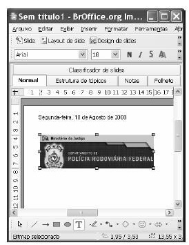 Considerando a figura acima, que ilustra uma janela do BrOffice.org Impress 2.4, contendo uma apresentação em processo de elaboração, julgue os itens a seguir.