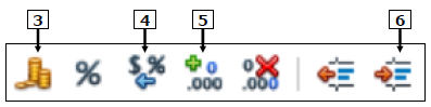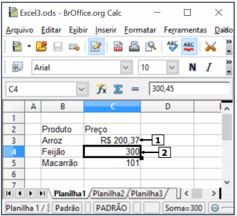 Para que a célula do BrOffice 3.2 Calc, apontada pela seta nº 2 (Figura 6(a)), passe a exibir o seu conteúdo com o formato de moeda e as casas decimais correspondentes, ou seja, R$ 300,45, ficando visualmente com o mesmo aspecto da célula apontada pela seta nº 1 (Figura 6(a)), basta pressionar, uma vez, o ícone de sua barra de ferramentas "Formatação", apontado pela seta nº: