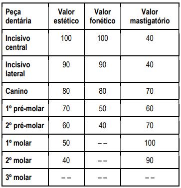 Na arquibancada de um estádio de futebol, um torcedor, sexo masculino, 22 anos, foi agredido na face com um murro e os elementos dentais 23 e 24 apresentaram o mesmo diagnóstico radiográfico: fratura radicular, oblíqua, no terço médio. Em virtude desse trauma, ambos os dentes foram extraídos e a vítima foi submetida a uma avaliação pericial. Na literatura odontológica, há tabelas que permitem a valoração do dano tanto funcional (fonético e mastigatório) quanto estético para perdas dentárias, como a tabela proposta por Dueñas, in Betran, apud Arbenz, que permite calcular o prejuízo estético e funcional considerando a importância de cada tipo de dente. No contexto da valoração do dano por perdas dentárias e considerando tanto o caso hipotético descrito quanto a tabela de Dueñas (que segue abaixo), assinale a alternativa correta e que contém, respectivamente, o valor dos prejuízos estético, fonético e mastigatório pela perda dos elementos dentários 23 e 24, ressaltando que a vítima, antes do trauma, possuía todos os dentes permanentes erupcionados e em oclusão, com exceção dos terceiros molares.