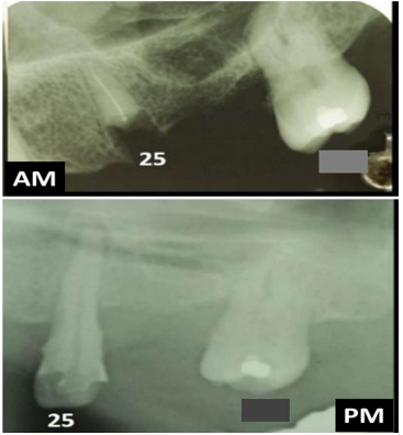 As radiografias odontológicas possuem grande importância para a identificação humana, pois podem exibir particularidades anatômicas, terapêuticas e patológicas específicas de um indivíduo, cujo corpo não pode ser identificado pelas impressões digitais, como nos casos de corpos carbonizados, putrefeitos e em decomposição avançada. Para subsidiar uma identificação utilizando-se radiografias odontológicas torna-se importante reproduzir no exame pós-morte (PM) as mesmas estruturas evidenciadas no exame produzido antes da morte (AM). Sobre os aspectos técnicos e periciais inerentes a uma identificação radiológica odontológica, analise as afirmativas a seguir, tendo como base uma adaptação realizada no confronto radiográfico AM e PM do trabalho publicado por Pereira e colaboradores (2021), sabendo-se que o lapso temporal entre as radiografias AM e PM é de cerca de 4 anos.