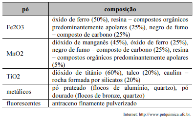 A técnica do pó, uma das formas de identificação de impressões digitais em uma cena de crime, consiste em aplicar uma fina camada de pó no local onde se supõe haver impressões digitais. O pó adere aos compostos químicos, principalmente à água, por isso, é importante que essa identificação seja feita nas impressões digitais mais recentes. Na tabela a seguir, são apresentados alguns tipos de pós usados em datiloscopia.