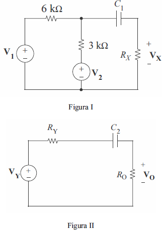Considerando que, nos circuitos esquematizados nas figuras I e II acima, V1 = V1∠θ1 V e V2 = V2∠θ2 V, em volts, sejam fontes senoidais de mesma frequência, C1 = C2, RX = RO e VX = VO, e considerando, ainda, que tais circuitos estejam operando em estado estacionário, julgue o item que se segue.