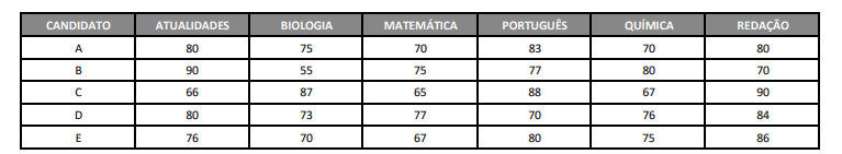 Cinco candidatos A, B, C, D e E estavam disputando uma única vaga de emprego em um hospital público e fizeram provas de atualidades, biologia, matemática, português, química e redação. As notas obtidas por eles estão apresentadas na tabela a seguir.