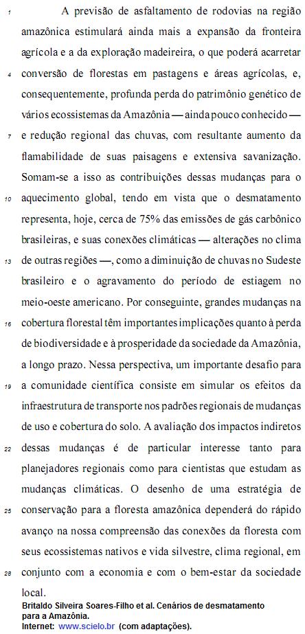 A correção gramatical e o sentido do texto seriam mantidos caso o trecho “o que poderá acarretar conversão de florestas em pastagens e áreas agrícolas” (l.3-4) fosse reescrito da seguinte forma: acarretando que os pastos cultivados e a agricultura convertam as florestas.