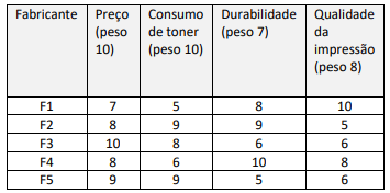 Um gerente precisa decidir qual impressora adquirir para o escritório da empresa em que trabalha. A tabela abaixo apresenta a avaliação das impressoras por fabricante, em cada um dos critérios de avaliação considerados, bem como os pesos atribuídos a cada critério.