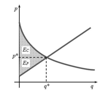 Em economia, duas medidas muito usadas de bem-estar social são o excedente do consumidor e o excedente do produtor. A figura a seguir ajuda a entender esses conceitos. Dadas a curva de demanda e a curva de oferta de um mercado, ambas determinam um preço de equilíbrio