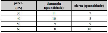 Considerando a tabela acima, que apresenta as quantidades demandadas e ofertadas de um produto, aos diferentes preços, relativos a um mercado em concorrência perfeita, julgue os itens a seguir.