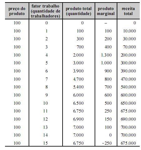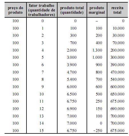 Considerando a tabela acima, que apresenta as relações de produção de uma empresa que tem unicamente o fator de produção trabalho, e que o preço de mercado do produto seja igual a 100 unidades monetárias, julgue os itens seguintes