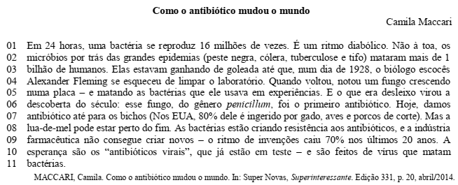 A reescrita do trecho: “...vírus que matam bactérias” (linhas 10-11), utilizando-se uma vírgula entre “vírus” e a oração “que matam bactérias” (“vírus, que matam bactérias”), produziria o sentido de que: