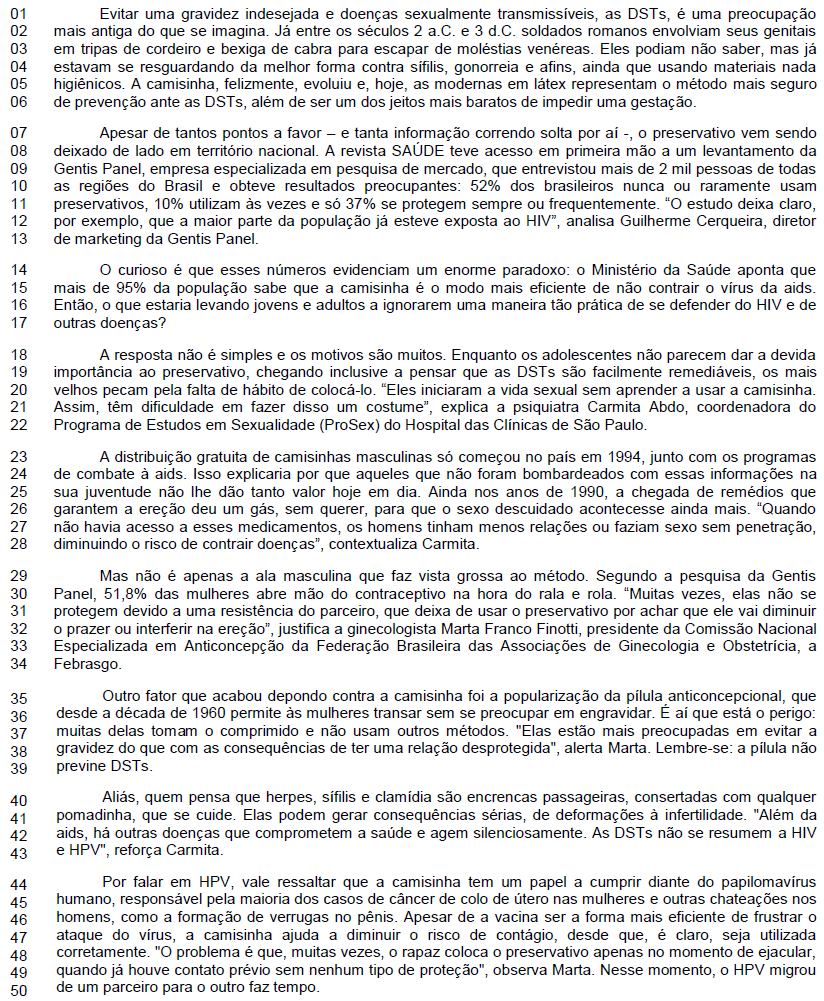 Com base no trecho transcrito “Aliás, quem pensa que herpes, sífilis e clamídia são encrencas passageiras, consertadas com qualquer pomadinha, que se cuide. Elas podem gerar consequências sérias, de deformações à infertilidade.” (linhas 41 e 42) Julgue as afirmativas: I. O autor, ao empregar a expressão “encrencas passageiras”, quer destacar que alguns brasileiros desconsideram a gravidade das doenças quando não fazem uso do preservativo. II. O emprego do termo “aliás” introduz uma explicação acerca da seriedade das doenças venéreas. III. Ao enumerar as graves consequências de doenças como herpes, sífilis e clamídia, o autor apresenta uma gradação que vai de um problema mais simples a outro irreversível. IV. O uso do diminutivo em “qualquer pomadinha”, na realidade, não faz referência nem ao tamanho, nem à qualidade do medicamento, mas à gravidade do problema, que não se resolve rapidamente. V. O autor, ao empregar o termo “quem”, visa dar um tom de impessoalidade ao seu discurso, que deve ser informativo a todos os brasileiros. Estão corretas as afirmativas: