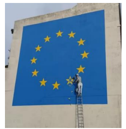 “Um novo mural do controverso e misterioso artista britânico Banksy apareceu na cidade de Dover, na Inglaterra. Na gravura, é possível ver um operário que retira uma das estrelas que compõe a bandeira da União Europeia.”