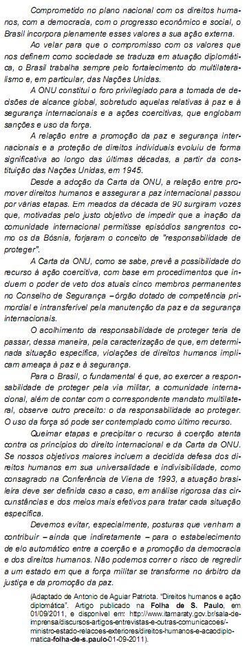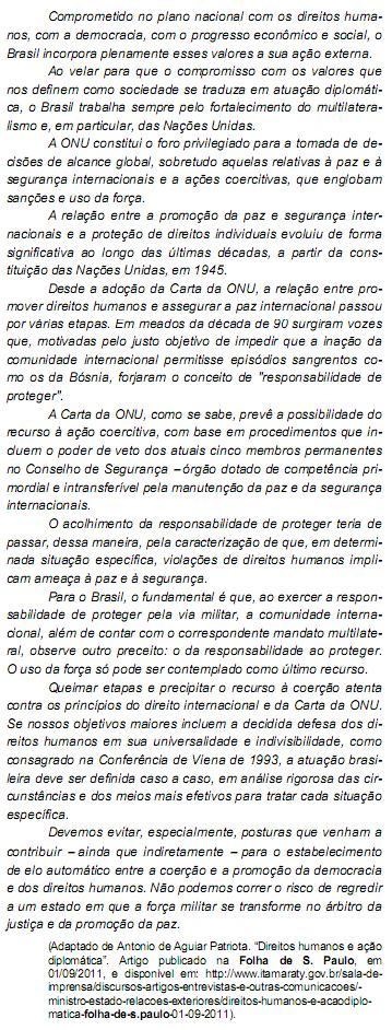 II. O acolhimento da responsabilidade de proteger teria de passar, dessa maneira, pela caracterização de que, em determinada situação específica, violações de direitos humanos implicam ameaça à paz e à segurança. (7o parágrafo)