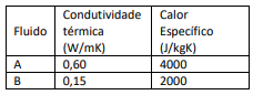 Um trocador de calor é formado por dois dutos concêntricos e tem configuração contracorrente. Nesse trocador, um fluido A é utilizado para resfriar um fluido B. Algumas propriedades térmicas desses fluidos são apresentadas na tabela a seguir.