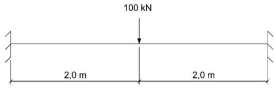 Uma viga biengastada, com seção transversal quadrada de lado 0,1 m, é submetida a uma carga concentrada no meio do seu vão, como ilustrado na figura a seguir.